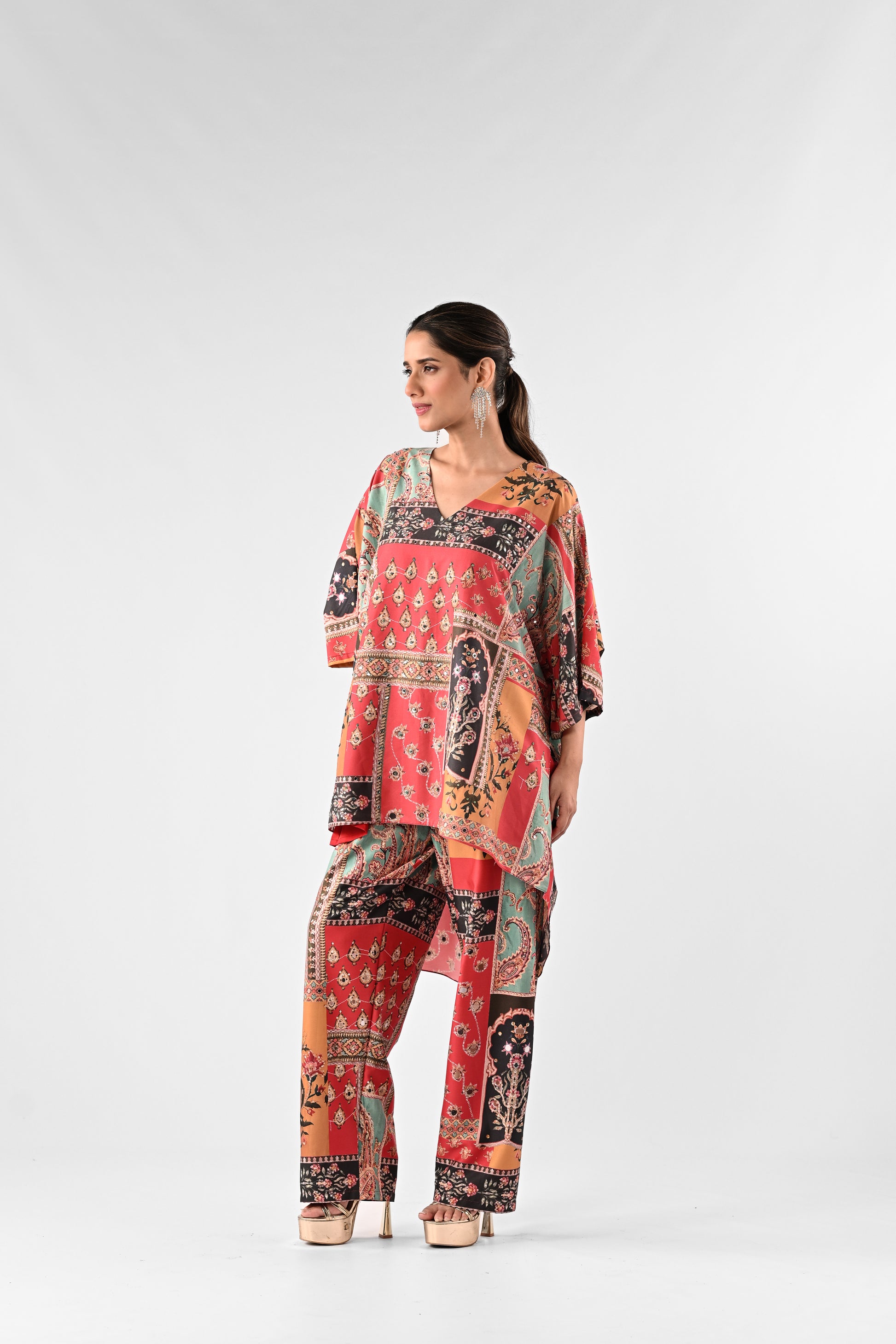 All-Over Printed Modal Satin Kaftan Top with Straight Pants Set