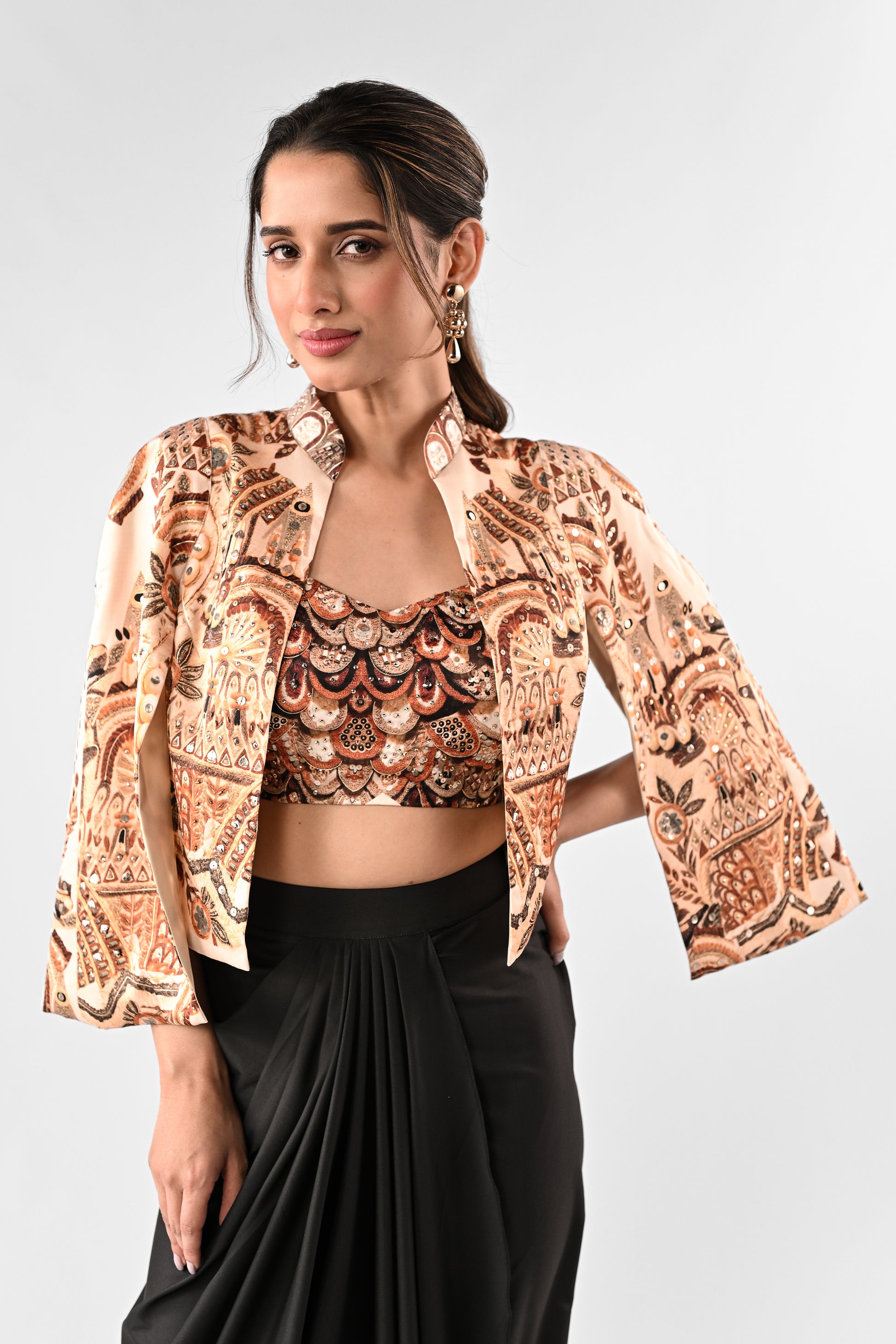 Embellished Printed Cape with Draped Skirt Set