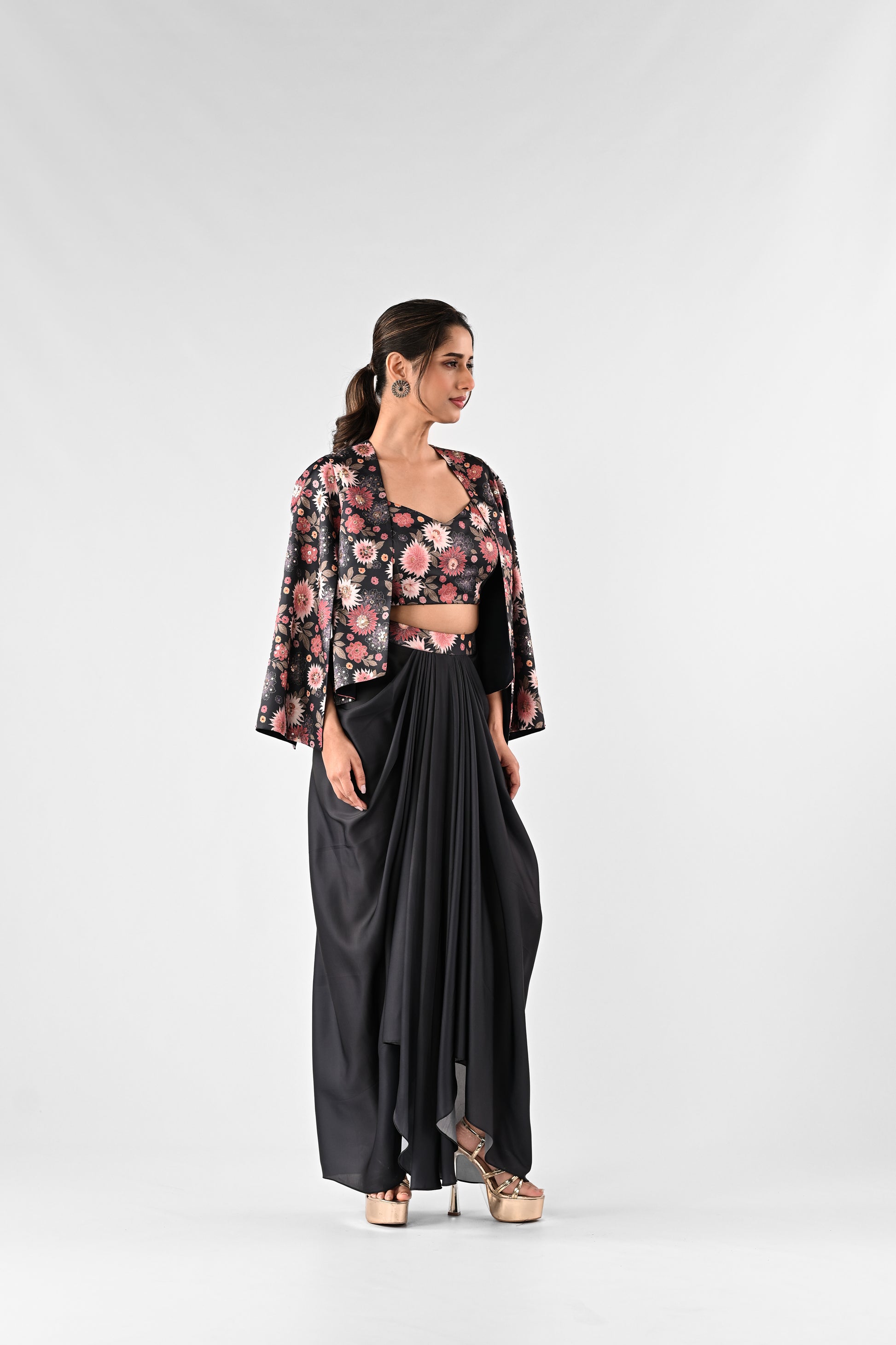 Embellished Printed Cropped Cape with Draped Skirt Set