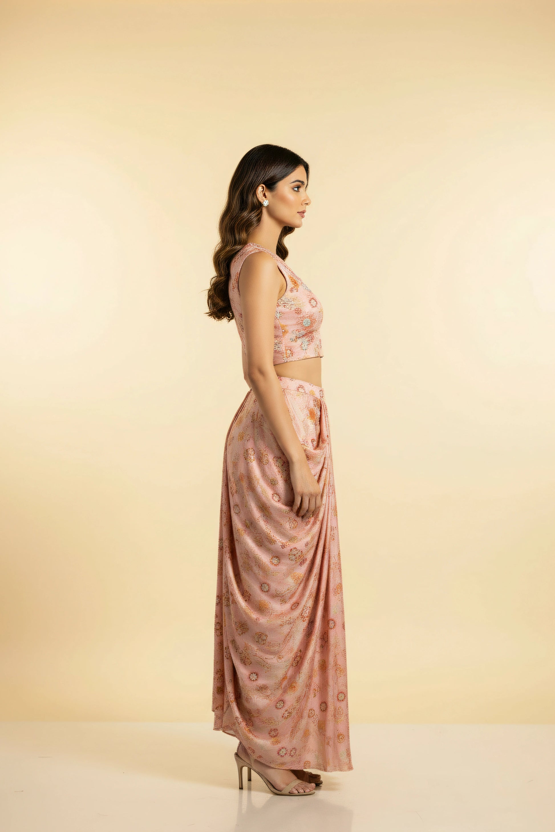 Crafted in poly modal satin co-ord set featuring a sleeveless embellished crop top paired with a draped printed skirt. Delicate embellishments enhance the floral print, creating an elegant and effortless festive look.