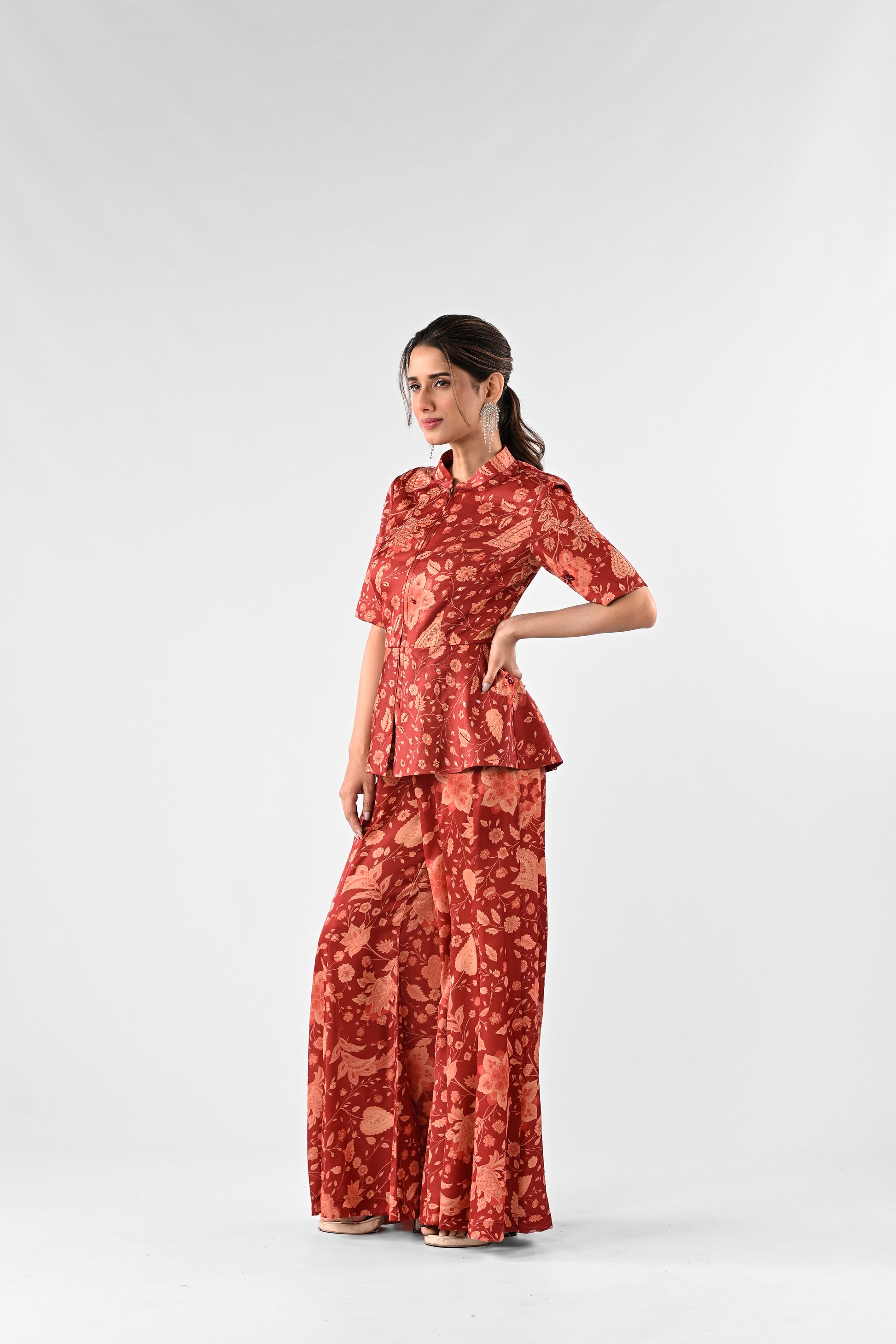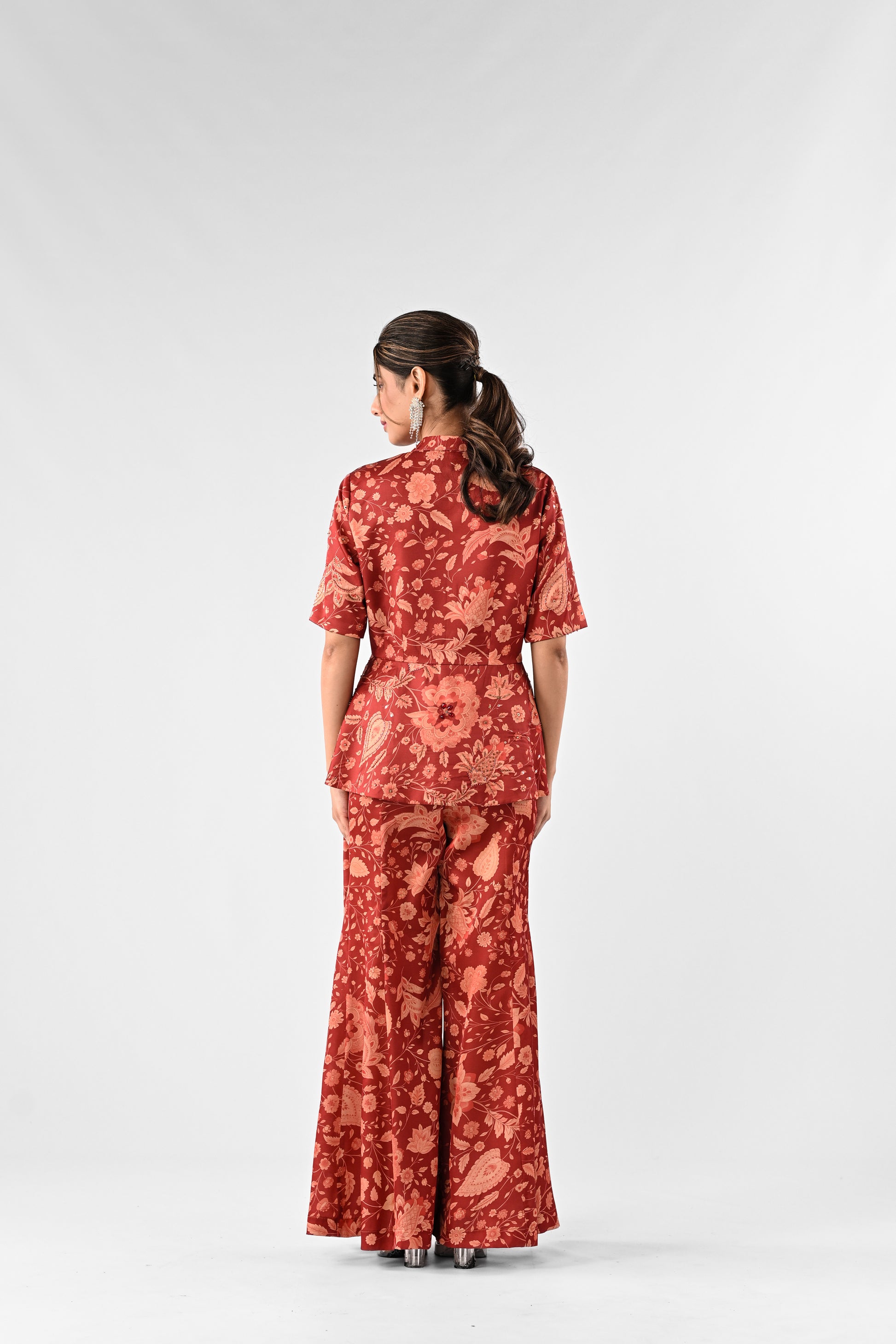 Crafted in poly modal satin, featuring a structured peplum top paired with complementing flared pants. The vibrant all-over print is subtly elevated with delicate embellishment highlights.