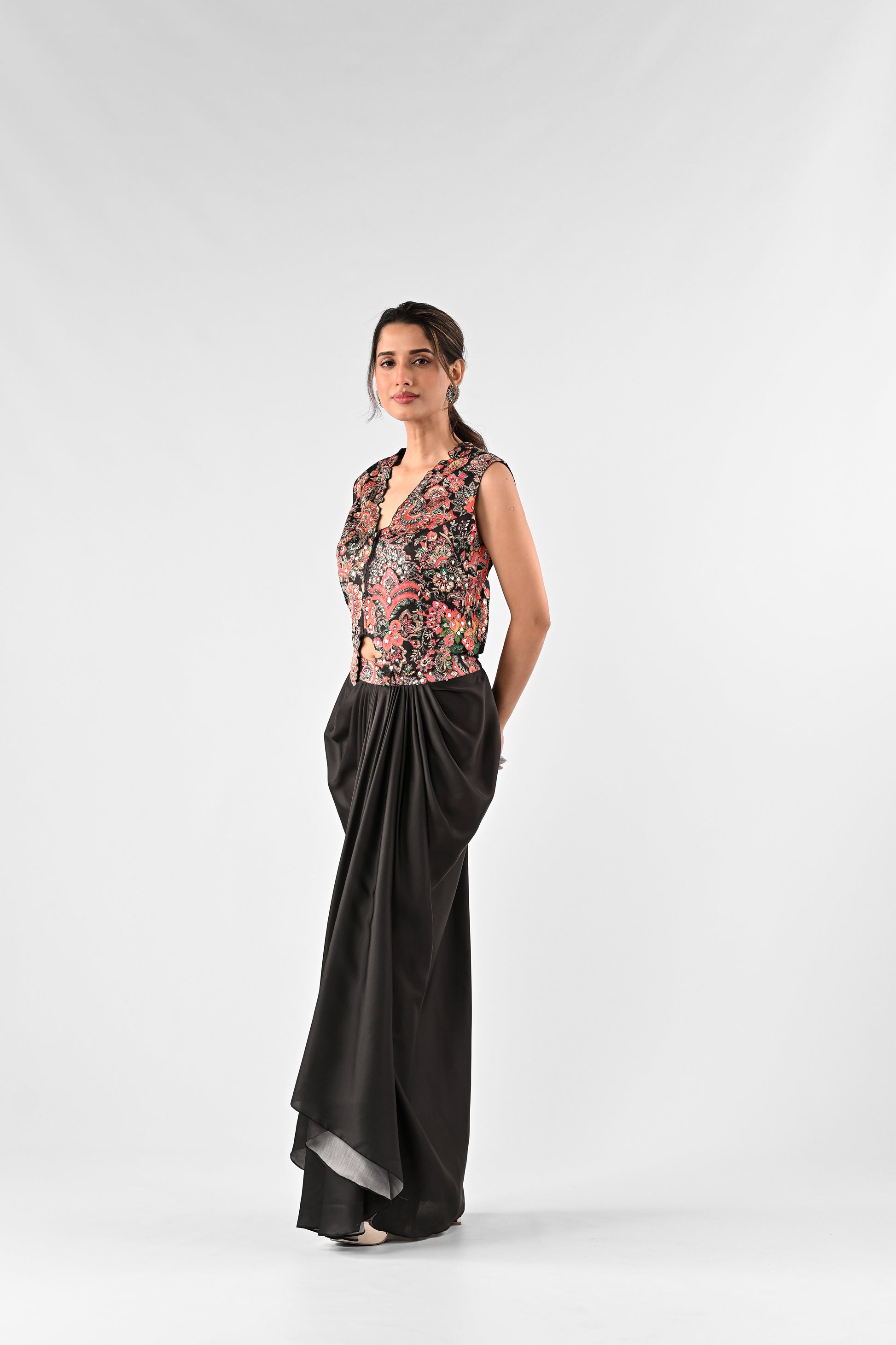 Embellished Printed Top with Draped Skirt Set